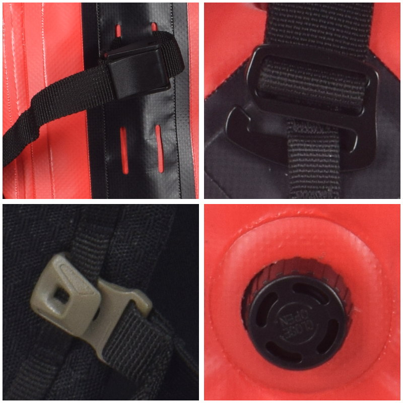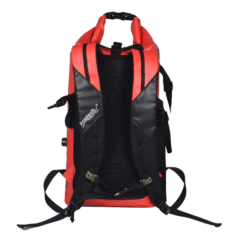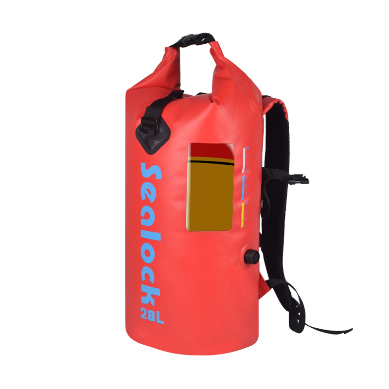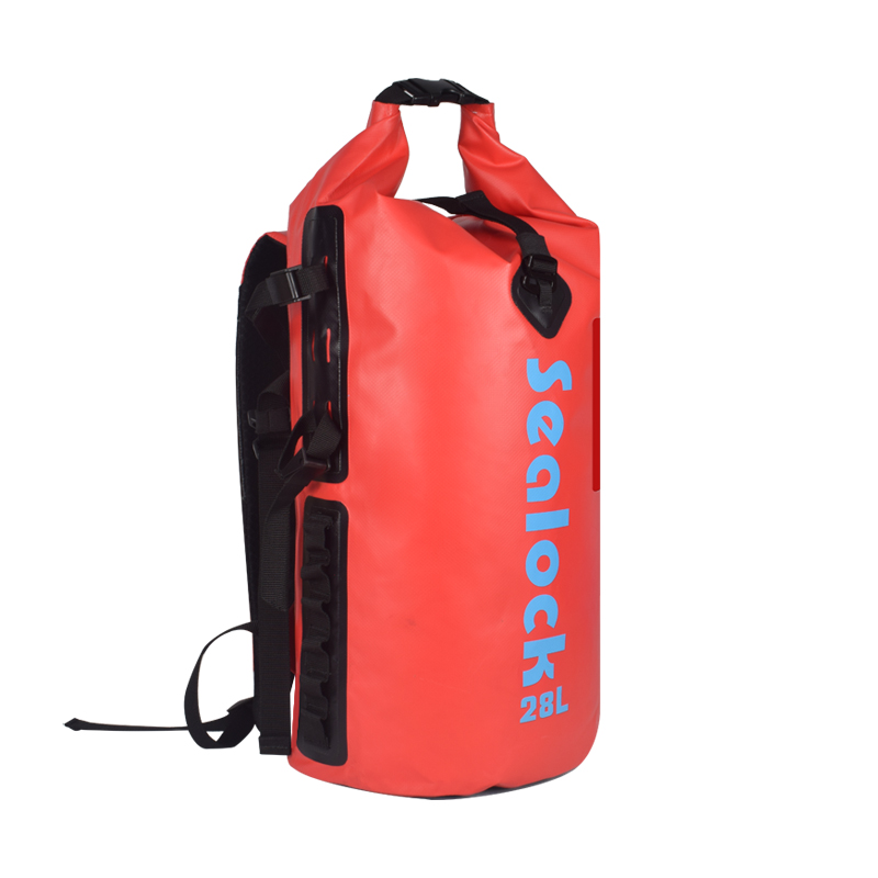 Kajakk vanntett bag 28 liter, vanntett kajakk ryggsekk materiale 500D PVC, tykkelse 0,5MM, hele posen er halvsirkulær design, det er et soltak for oppbevaring av mobiltelefoner på forsiden, du kan bruke mobiltelefonen til å holde tørr, legg til en multifunksjonslås, lås padlebrettet, akkurat det er en tømt og oppblåsbar enhet på siden, som kan fylle posen med gass til maksimal grad, midlertidig livreddende beskyttelse, og bære EVA i ett stykke på baksiden for å redusere vekten og varmen under fotturer. Kapasiteten på 28 liter tåler en dags lek.